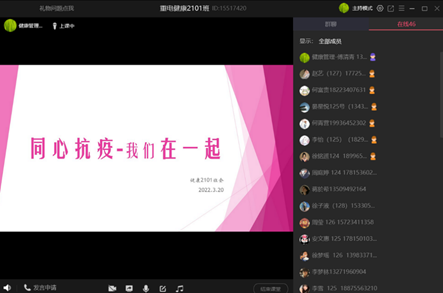 2022年3月20日晚,智慧健康学院全体辅导员、班主任利用腾讯会议APP、QQ群课堂等平台,开展了“同心抗疫”主题班会。本次班会旨在教育引导同学们消除负面情绪、积极客观应对疫情,帮助学生调节情绪,建立心理防线,科学制订学习生活计划。