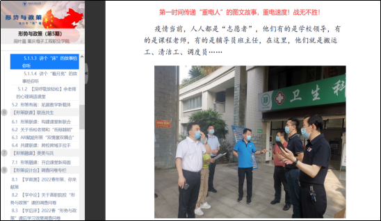 3月11日晚,重庆大学城有了首例新冠确诊病例。疫情就是命令,学校当晚紧急行动,采取果断有力措施,全力以赴做好新冠肺炎疫情防控工作。全校师生众志成城,共克时艰,共同迎战这场抗疫大考。本轮疫情发生以来,重电党委行政在习近平新时代中国特色社会主义思想的指导下,深入贯彻落实习近平总书记在全国抗击新冠肺炎疫情表彰大会上的重要讲话精神,领导全校师生齐心抗疫。无论白天黑夜,校园里有众多平凡的重电人在“不起眼”的位置,做着“不起眼”的事情,汇聚着平凡微光,挺立起磅礴精神,成为抵御新冠肺炎疫情最坚强的支持和后盾。抗疫,是一场大考,也是一堂感人肺府的思政课。马克思主义学院形势与政策教研室(以下简称“形策”教研室)全体教师“就地取材”,讲好抗疫故事,将这些最感人、最现实、最深刻、最鲜活的重电思政素材用到了“形势与政策”课中,弘扬伟大抗疫精神,厚植学生爱国情怀,将师生凝心聚力的抗疫感人故事转化为坚持和发展中国特色社会主义、建设社会主义现代化强国、实现中华民族伟大复兴的强大动力。