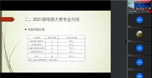 为做好2021级专业类招生专业分流工作,根据《重庆电子工程职业学院专业类招生专业分流管理办法》和《电子与物联网学院2021级电子信息大类专业分流实施方案》,结合学校疫情防控细则,电子与物联网学院于3月31日,通过线上方式召开“电子与物联网学院2021级电信大类专业分流工作”推进会,学院全体教职员工参会。