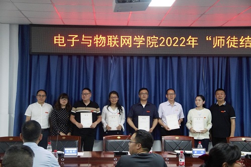 为帮助新进教师尽快融入教学团队,发扬“传帮带”光荣传统,发挥骨干教师的示范引领作用,落实“助教制”要求,电子与物联网学院于4月28日在12-507B会议室隆重举行了2022年度春季“师徒结对”拜师仪式。学院党总支书记张红斌、院长陈良、副院长熊德明以及全体指导教师、新进教师参加仪式,特别邀请人力资源处黄祎副处长出席。本次拜师仪式由学院院长助理陈方艺主持。