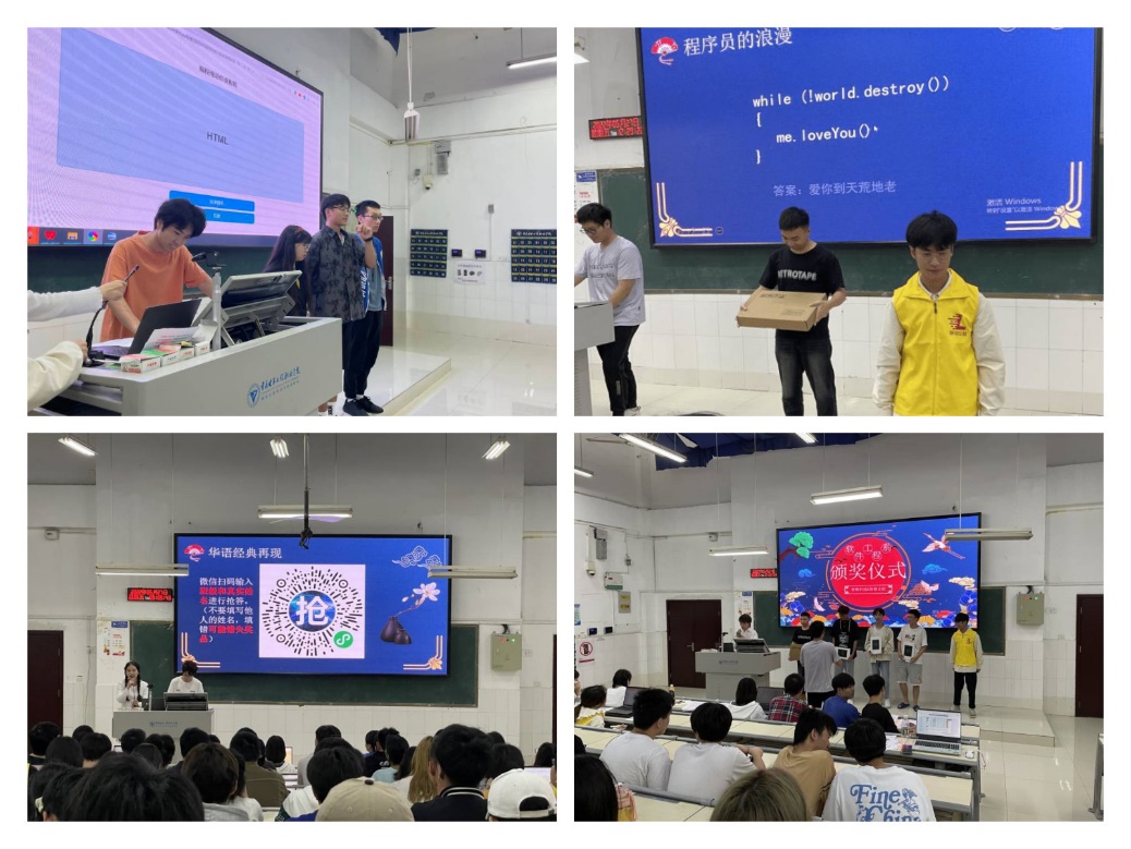 在老师致辞后,活动进行到游戏环节。游戏专业都不赖之你说我猜:每班派出两支队伍代表班级参加游戏,同学们为班级得分而战,在游戏过程中增强班级凝聚力。华语经典再现之猜歌名:用微信小程序抢答的方式进行游戏,同学们聚精会神,积极参与,涌现不少音乐达人。程序员的浪漫之猜诗句:通过屏幕上给出的伪代码猜出对应的诗句,对同学们的程序理解能力和文化水平提出考验。同学们积极思考,表现出专属于程序员的浪漫。