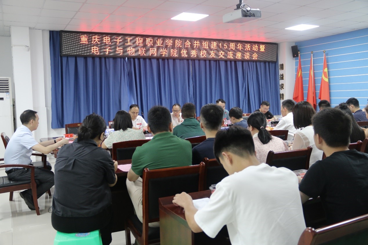 为凝聚校友力量,助力学院发展,促进形成“携手共进,齐创未来”的良好局面。6月28日,电子与物联网学院在12-507A会议室举行重庆电子工程职业学院合并组建15周年活动暨电子与物联网学院优秀校友交流座谈会。本次校友座谈会共邀请了6位优秀校友,从全国各地回到阔别已久的母校,追忆同窗旧事,再叙师生情谊,畅谈人生感悟,共话未来发展。优秀校友也为学弟学妹们分享职业生涯规划与经验,充分发挥优秀校友的榜样力量,并为学院发展提供宝贵意见。电子与物联网学院党总支书记张红斌、院长陈良、党总支副书记毛弋、副院长熊德明、校双高办副主任、院党政科主任廖金权、院项目办主任李明及物联网系、集成电路系、学管科教师代表,大一学生代表参加了座谈会。本次座谈会由电子与物联网学院党总支副书记毛弋主持。