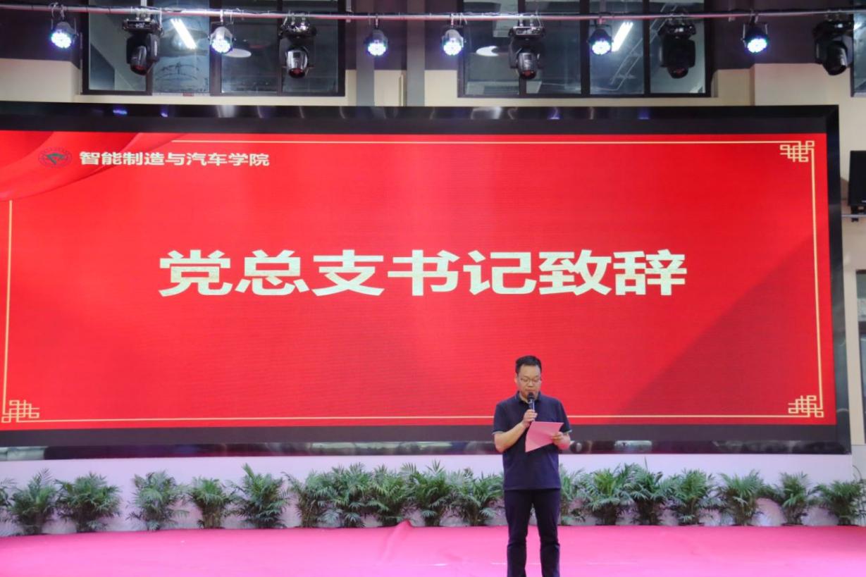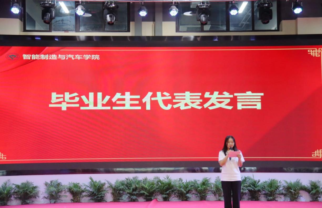 在热烈的掌声中,智能制造与汽车学院党总支书记张进春致辞。张书记寄语毕业生“志当存高远,青春需作为”,向圆满完成学业的2022届的同学们表示热烈的祝贺,也向各位付出辛勤劳动,培育学子的老师们表示衷心的感谢。同时他表示,希望同学们脚踏实地,精耕细作,拓展人生深度;希望同学们志存高远,不忘初心,保持人生力度;希望同学们心怀大爱,放眼世界,提升人生高度。辅导员代表肖璐发表寄语,纵使前路有荆棘,亦当奋力奔跑,希望同学们脚踏实地、追求卓越,为实现中华民族伟大复兴贡献自己的青春、智慧和力量。毕业生代表乔娇阳总结她三年校园时光,她说她将会永远铭记重电校训“厚德强能,求实创新”,传承“龙翔马越、博润致远”的人文精神,毕业后也会以优异的成绩骄傲地向母校报告。
