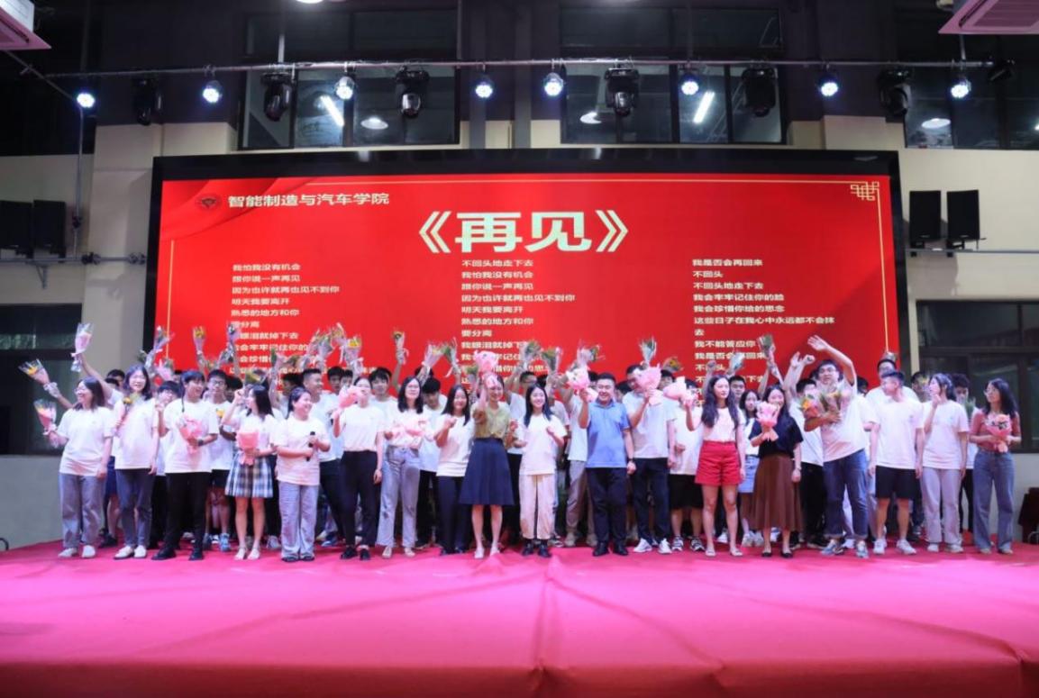 学院领导为毕业生代表颁发了毕业证书并进行了合影留念,证书颁发完毕后,所有毕业生辅导员上台,毕业生向自己的辅导员请假离校,同学们为学院领导、辅导员送上鲜花,最后所有老师和同学们在舞台上一起合唱《再见》。