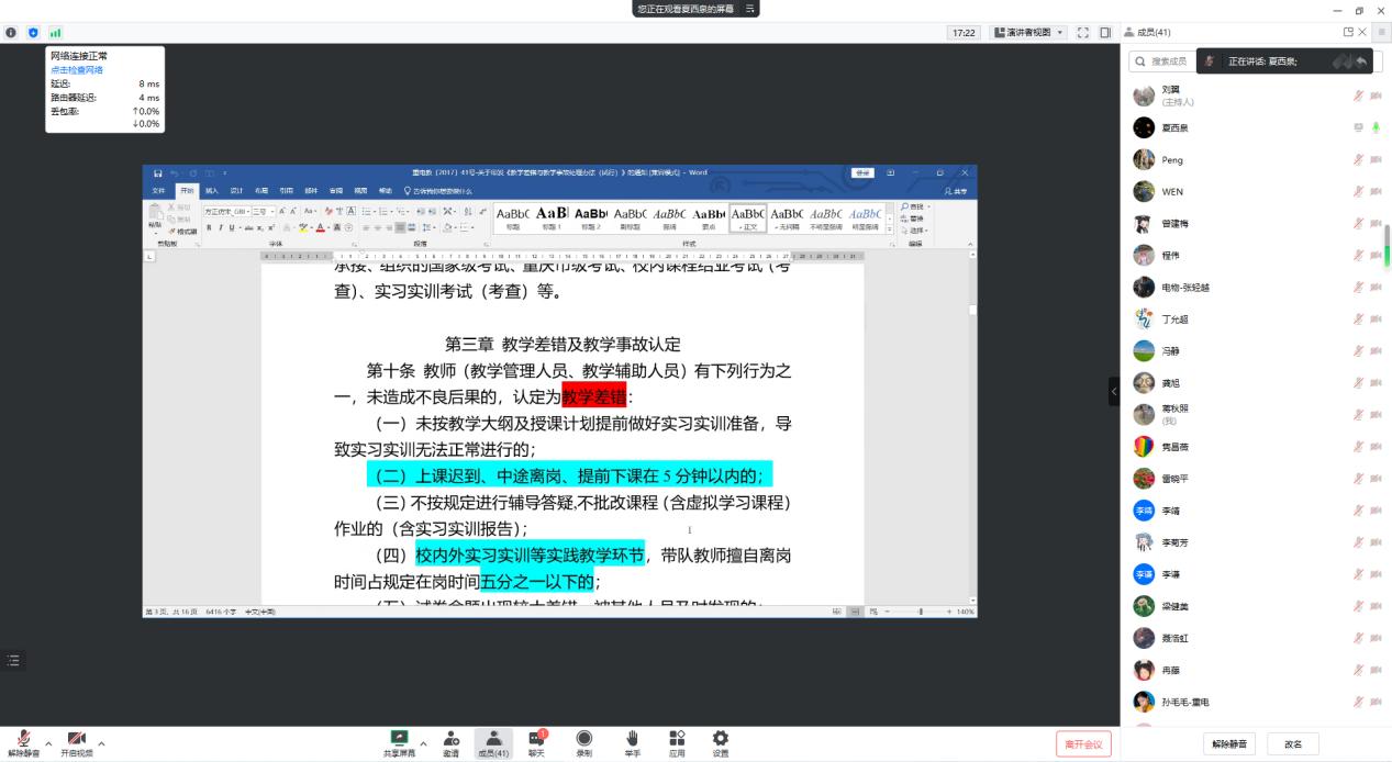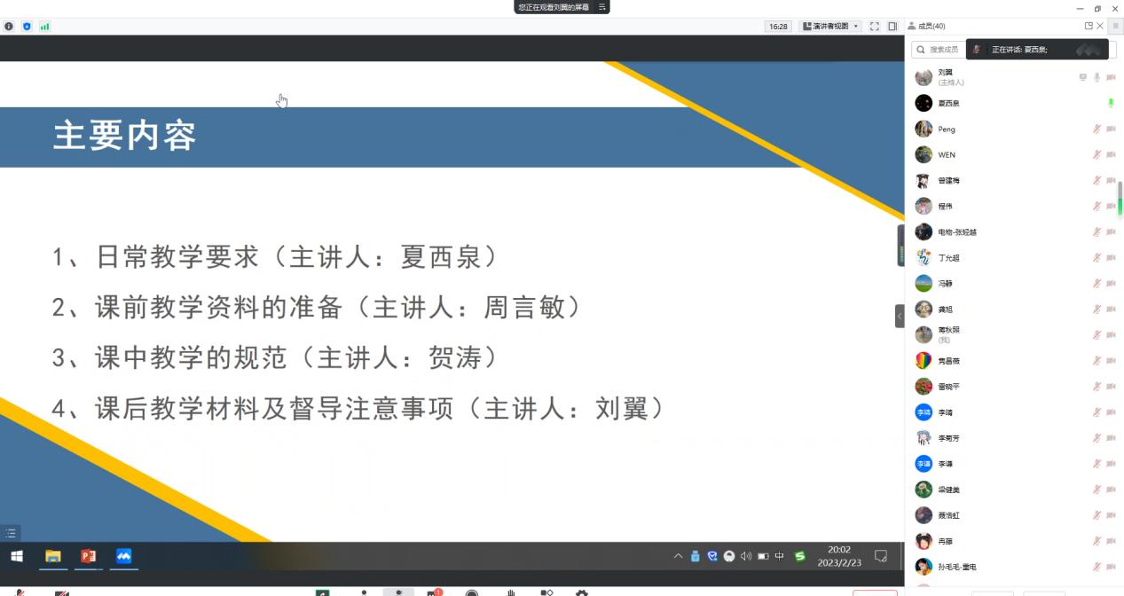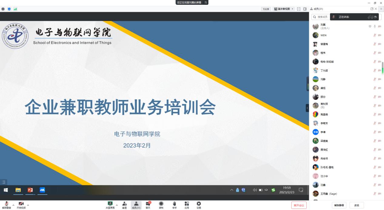 为进一步规范企业兼职教师教学行为,加强企业兼职教师教学管理工作,提高外聘教师教学质量,电子与物联网学院于2月23日通过线上方式组织召开“2023年春季企业兼职教师业务培训会”。学院夏西泉副院长、刘翼科长、各系主任、教学秘书、校内一对一指导教师及全体企业兼职教师参会。