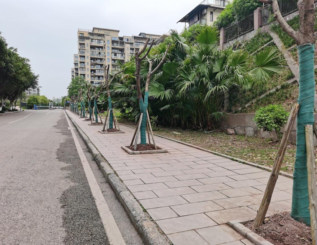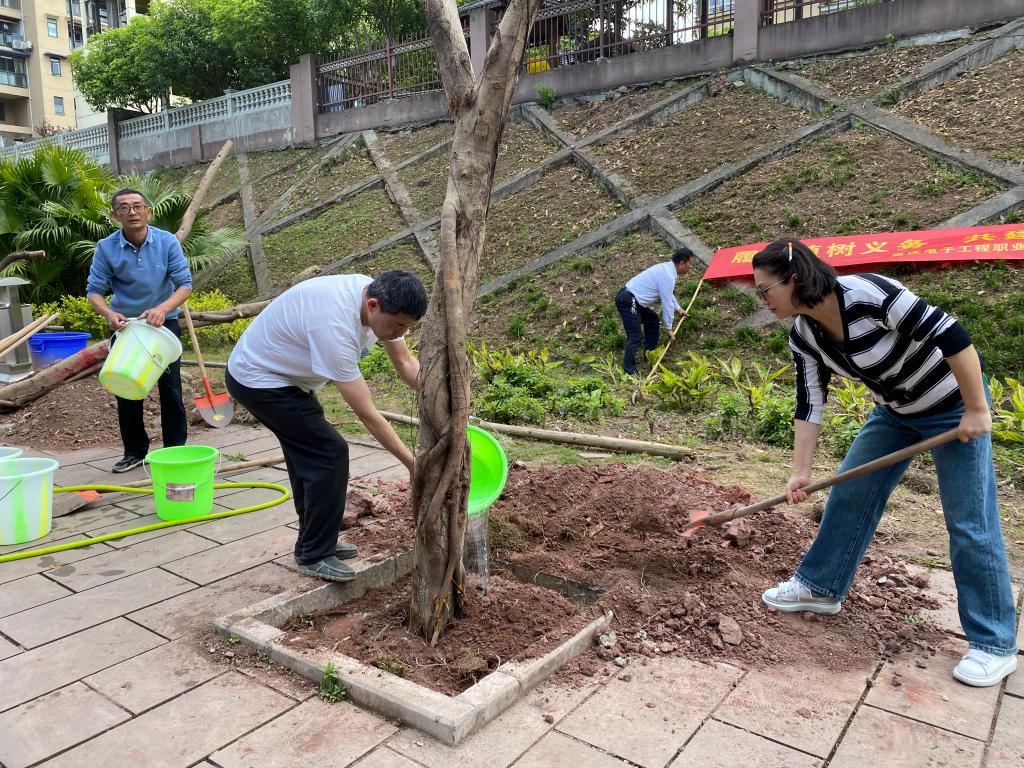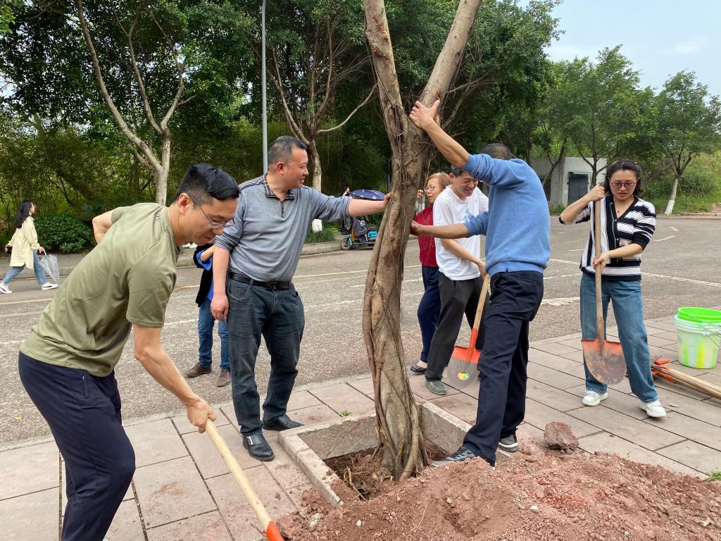 在植树现场,大家分工合作,默契十足,挖坑、栽树、培土、浇水,经过一上午的辛勤劳作,一排挺拔的行道树伫立在人行道边。