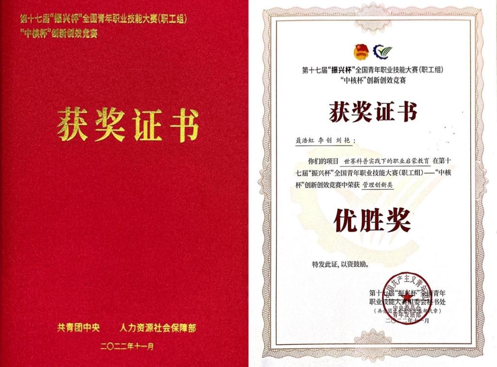 近日,由共青团中央、人力资源社会保障部联合举办的第十七届“振兴杯”全国青年职业技能大赛(职工组)——“中核杯”创新创效竞赛全国决赛落下帷幕。本次大赛聚焦关键领域、重点行业,设置研发创新类、技术革新类、管理创新类三个竞赛方向,涵盖机械与控制、信息技术、生命科学、能源化工、社会服务等领域,是“振兴杯”首次面向青年职工举办的创新创效竞赛。大赛以线上线下相结合的方式进行,共吸引来自全国29个省份、7个行业系统的261个项目。经过层层选拔,我院团总支书记聂浩虹老师、辅导员李创老师、辅导员刘艳老师共同完成的项目——《世赛科普实践下的职业启蒙教育》荣获管理创新类方向“全国优胜奖”。