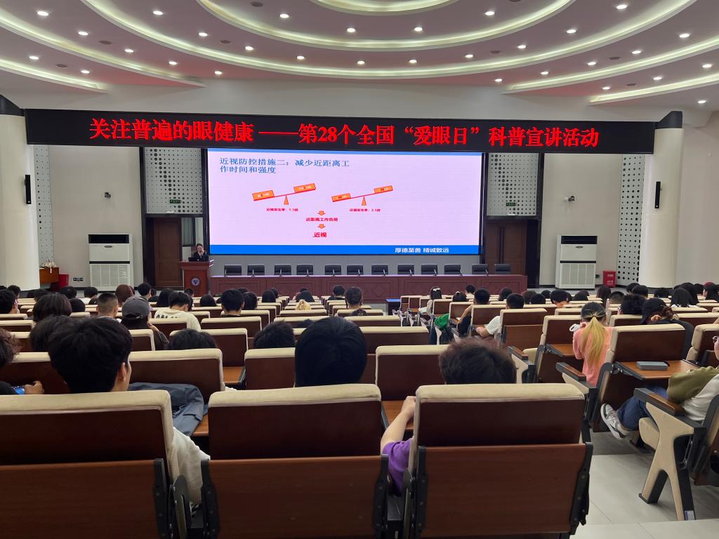 随着近距离用眼增加,我国青少年近视发生率增高,而高度近视对眼睛有极大危害。为增强学生爱眼护眼意识,督促学生养成保护视力、预防近视的良好行为习惯,有效防控近视,结合第28个全国“爱眼日”关注眼健康主题,后勤保障处卫生科于2023年6月21日下午特邀陈家桥医院临床眼科医生在我校博远厅举行近视防控科普讲座。
