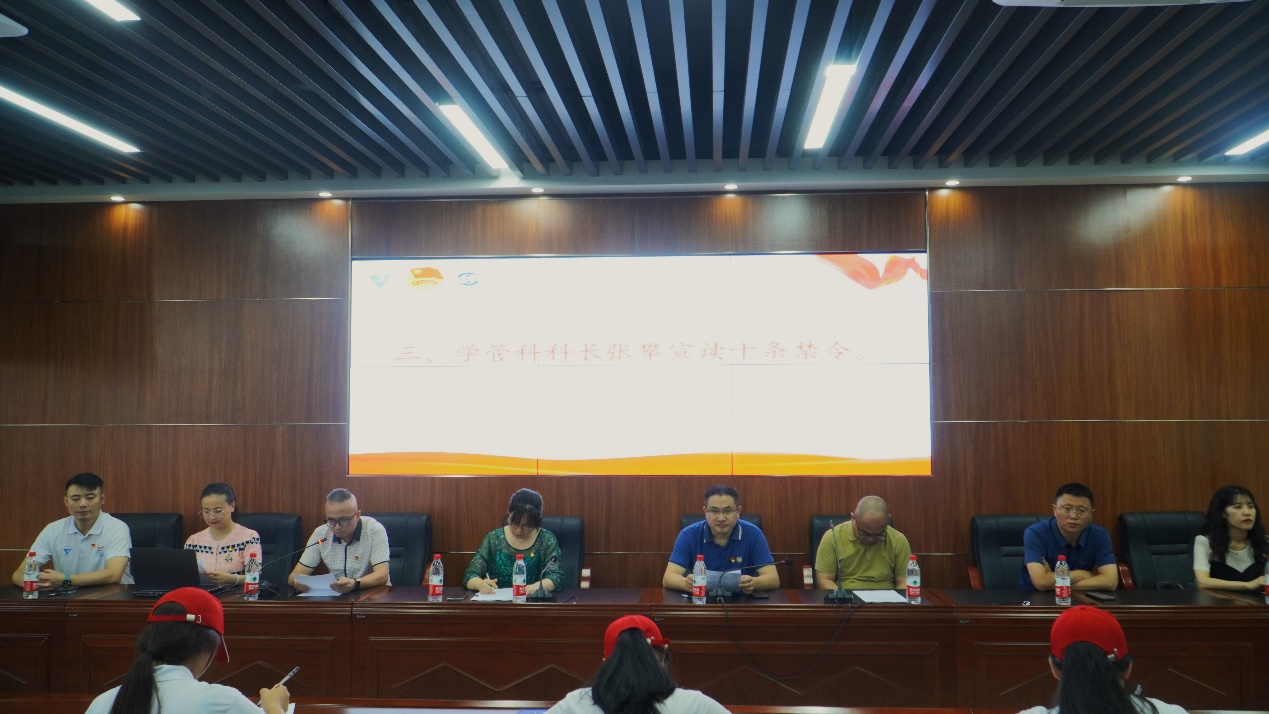图注: 学管科科长张攀老师宣读了《重电暑期“三下乡”十条禁令》