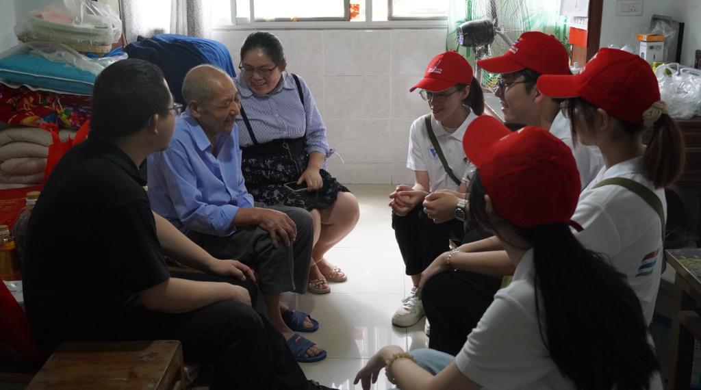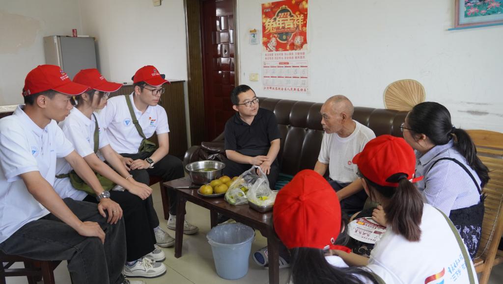 图注:实践团成员们津津有味地听着万开华老党员讲述动人故事