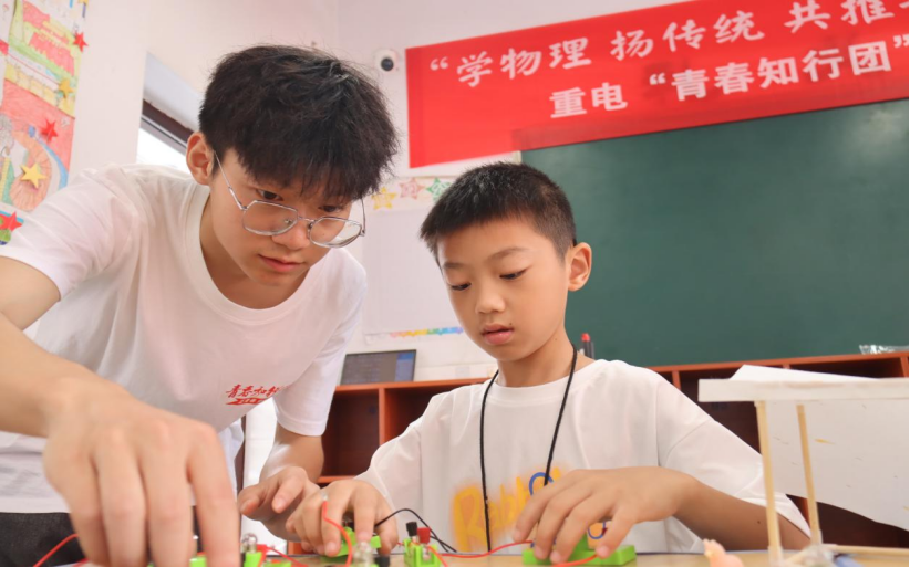 在“推普+科普”物理趣味小课堂上,实践队依托工科专业优势,以科技赋能推普,为小朋友们讲解了电磁感应、串并联电路的物理原理,引导小朋友们将汉字小纸条贴在铜丝上,在电池转动的过程中观察纸条上的词语并造句。实践队队员们从普通话发音、表达应用等方面入手,提升孩子们国家通用语言文字应用能力,规范课堂语言文字,同时提高孩子们对科学文化的兴趣。