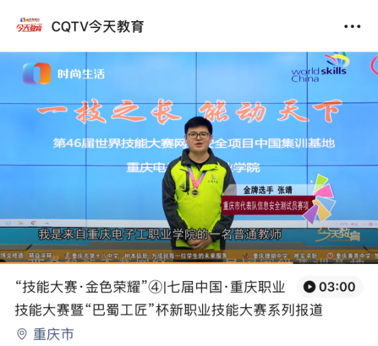 重庆卫视《今日教育》对金牌选手张靖报道视频截图